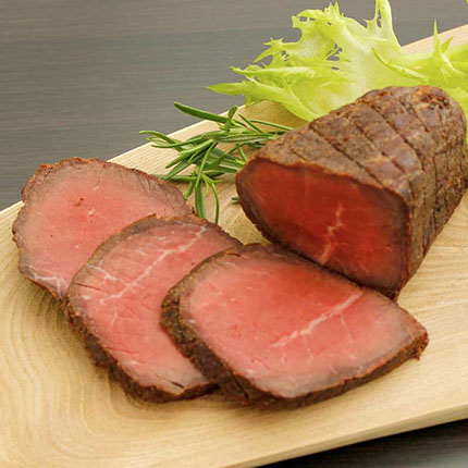 国産生豚ロース肉を使用し、うす味仕立てに仕上げています。表面を軽く焼いて温めると赤身と甘味のある脂がとろけジューシーで豊潤な旨味がひろがります。お好みによりケチャップ、大根おろし、ぽん酢やステーキソースなどお好みのソースでお召し上がりください。